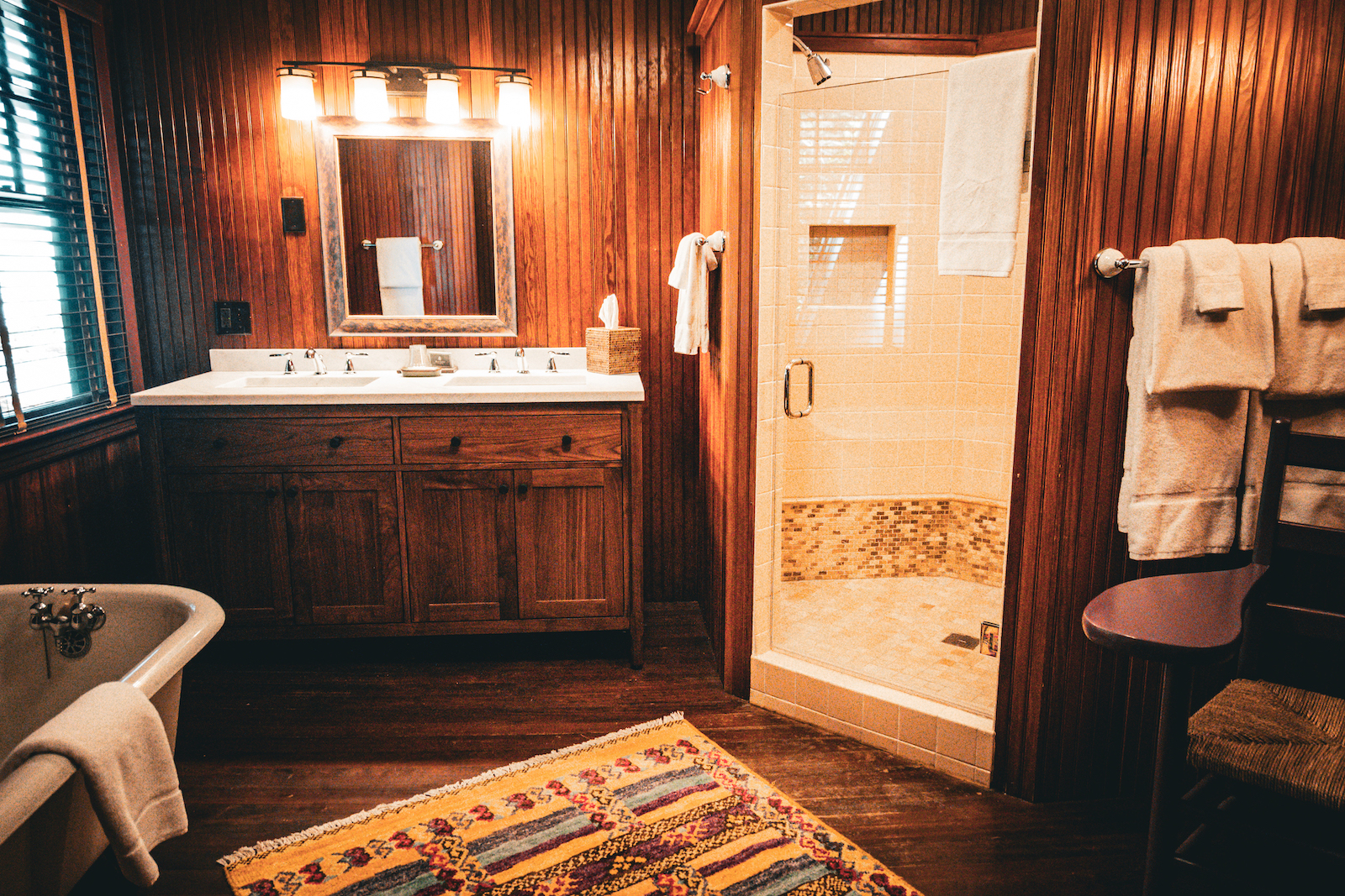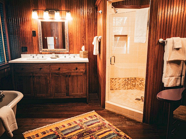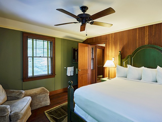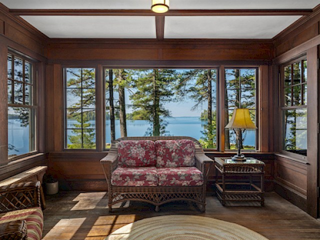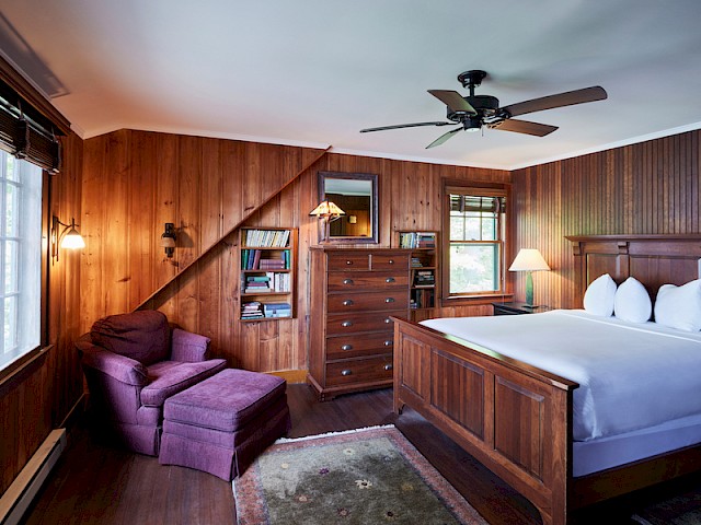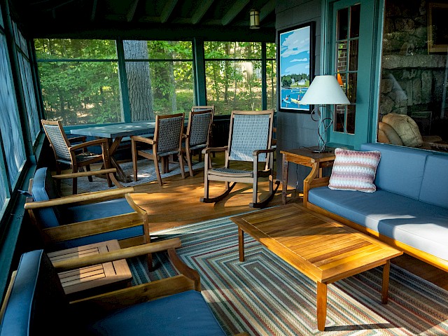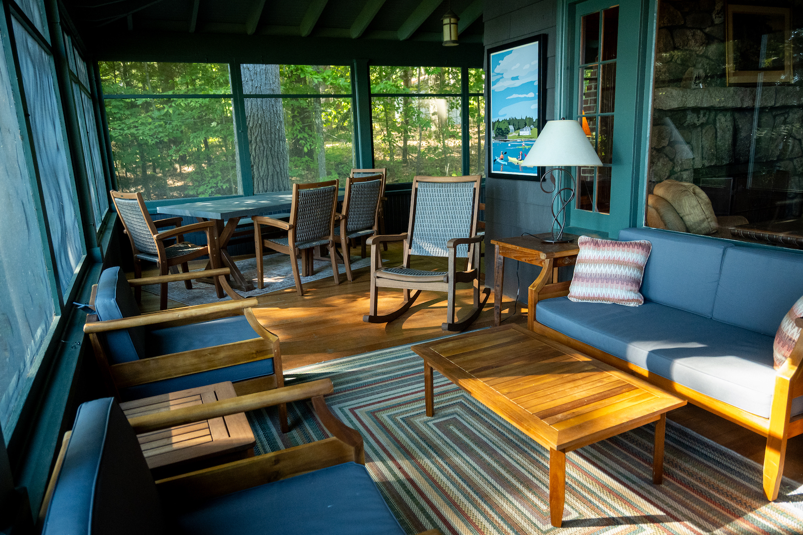 Lake House is a five bedroom, five and a half bath two story classic Maine lakeside cottage. There is a private terrace with lounge chairs as well as a private beach area in front of the cottage. On the first floor is a wraparound screened porch, sun room, large living room with fieldstone fireplace, TV room (with pullout couch and attached ½ bath), and wet bar with undercounter refrigerator. The primary bedroom with king bed and private bath is also on the first floor. The second floor has three bedrooms each with queen bed, plus one bedroom with a king or twin beds; each of these 4 bedrooms has a private bath. There are three steps to enter from the parking area behind the cottage.
