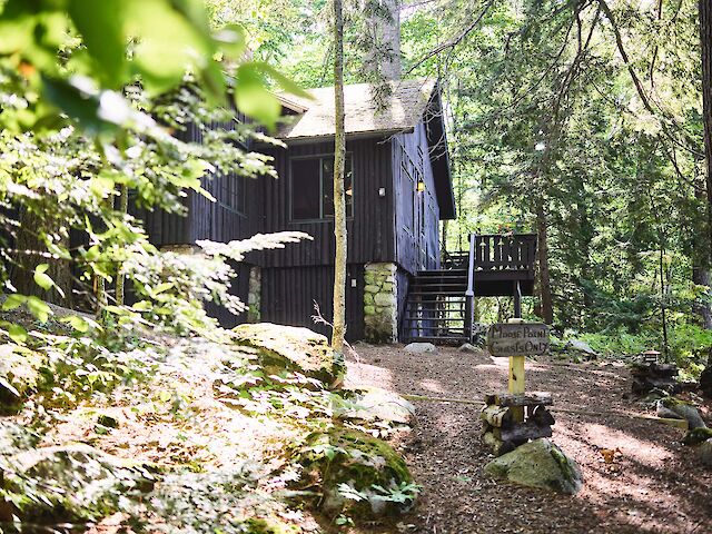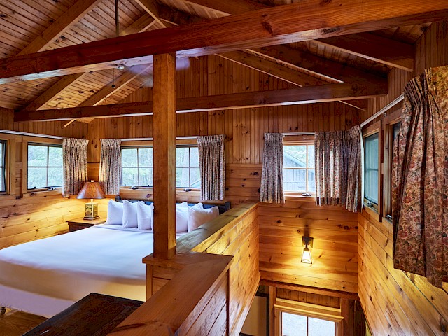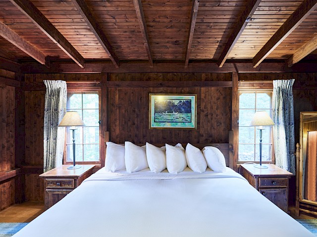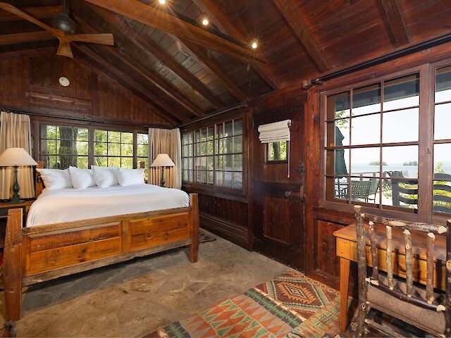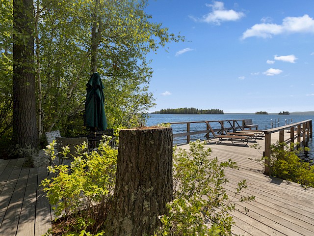 Moose Point is a special secluded lakeside cottage with its own private dock. The cottage has an open front deck, a spacious living room with cathedral ceiling, fieldstone fireplace with a seating area on one side and a large table which is great for family activities. The cottage is equipped with a flat screen TV and a “kitchen” with an undercounter refrigerator and plenty of storage. The primary bedroom has a king bed and the adjacent bathroom has a tub/shower combination. The second bedroom can be set up as king bed or twins and the en-suite bathroom has a combination tub/shower. The third bedroom is located in the second floor “loft” and can be set up as a king bed or twins. The living room has a queensize pullout couch and room for a cot or pack ‘n play. There is adjacent private parking and the walk to the Main Lodge takes around 3 minutes over a wooded path. The Moose Point “guest house” is located about 50 yards from the main house deck, right on the lake. This studio bedroom has large front windows, a queen bed, small sitting area, wet bar with undercounter refrigerator, and ½ bath. Just outside is a tiled shower room. The “guest house” opens up to a private dock furnished with lounge chairs and is great for a swim or for tying up small boats.