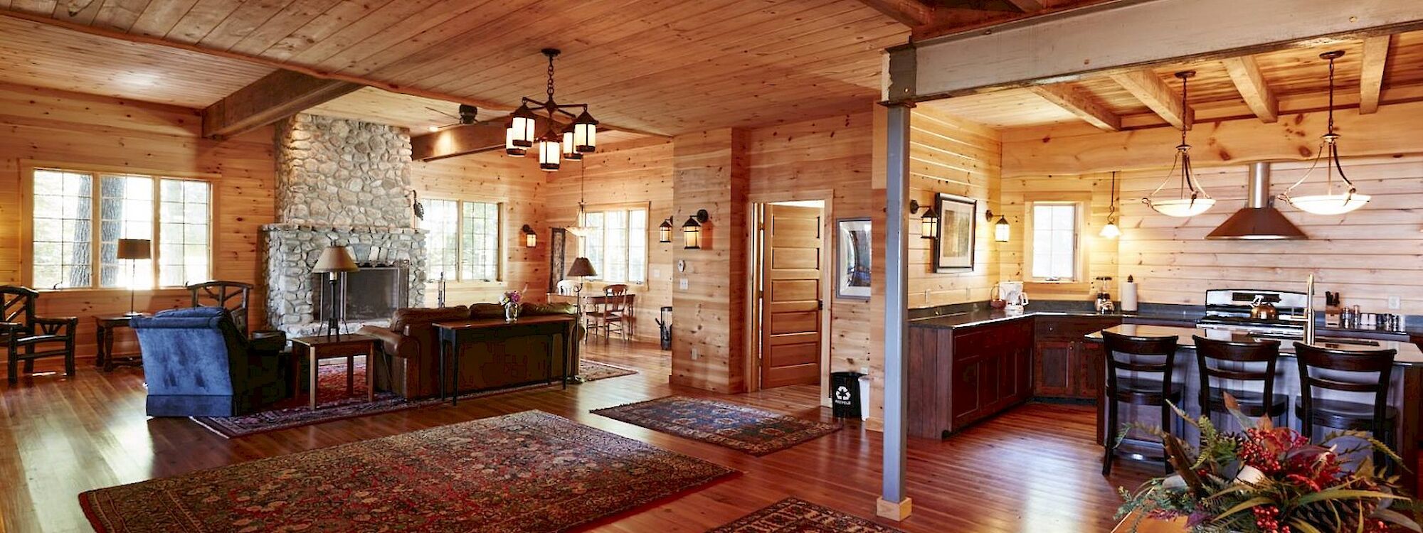 Tall Pines is a three bedroom, three and a half bath home with four fireplaces. The great room has a cathedral ceiling, flat screen TV, dining room seating for 10, and fully equipped gourmet kitchen. There is a ½ bath on the first floor, a screened porch, and a king bedroom with full bath. Upstairs are two bedrooms, each with private balcony and bath. There is an outside fireplace, private beach, dock with canoe and kayak and was featured as “Home of the Month” in Yankee Magazine.