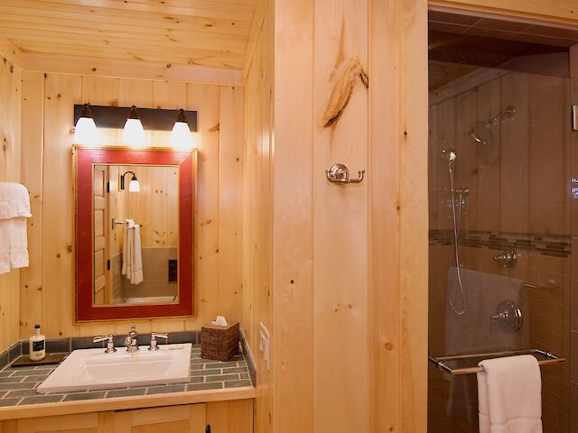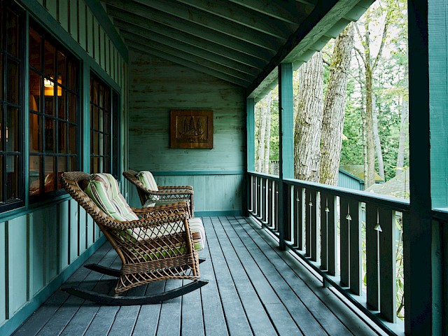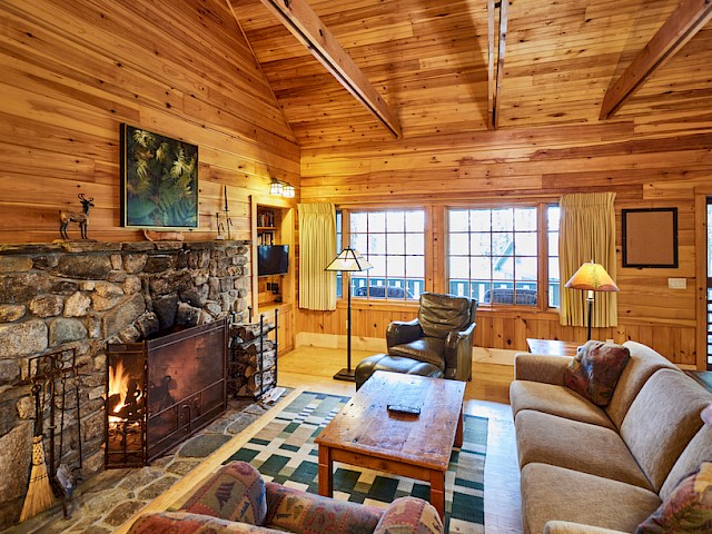 Tamarack, located near our Main Lodge, is one of our largest one bedroom cottages. The furnished front porch has lake views and the living room has cathedral ceiling, fieldstone fireplace, flat screen TV, and wet bar with undercounter refrigerator. Up a few steps is a large walk-in closet, a full bath with soaking tub, separate shower, and a convenient additional vanity just outside. Just behind is the spacious bedroom with two queen beds. There is a queen-size pullout couch in the living room and room for cot/pack ‘n play. There are 11 steps to the front porch.