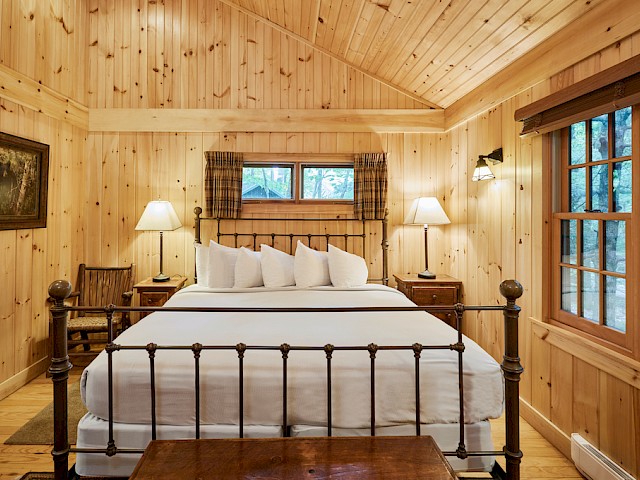 Enter Ridge through a roomy furnished screened porch, one of only two on the property. Enjoy the wood stove on the porch, or the fieldstone fireplace in the living room which also has a cathedral ceiling and flat screen TV. The wet bar and undercounter refrigerator are on the screened porch. The primary bedroom has a king bed and private bath with tiled shower and the second bedroom has a queen bed and en-suite bath with shower. The third bedroom can be a king bed or twin beds, and the adjacent full bath has a shower/tub combination. There is a queen-size pullout couch in the living room and space for a cot and/or pack n play. There are about 8 stone steps leading into Ridge, which has a woods (not lake) view.