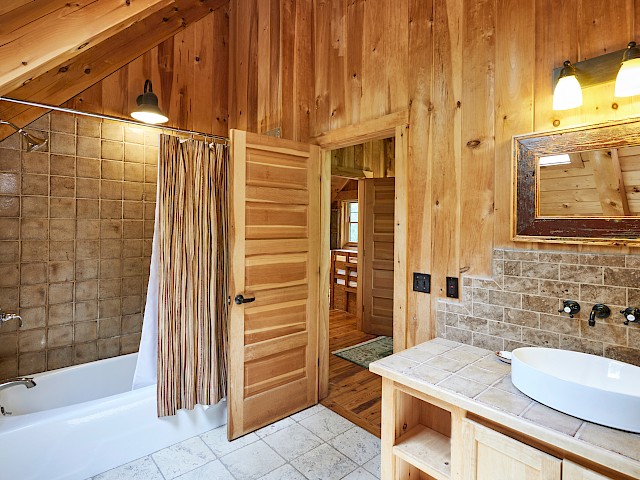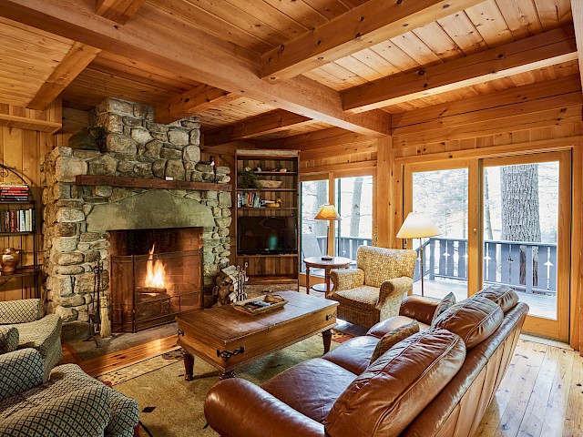 Timbers is a centrally located post and beam cottage with two bedrooms (one with king bed, one with queen) and two full baths (one with shower/tub, one with steam shower) upstairs and a loft space with twin beds. There is also a small first floor single bed alcove with a half bath adjacent to the nearby living room. There is a large furnished open deck, living room with massive fieldstone fireplace, a dining table (great for family games, crafts and puzzles) and a full kitchen. All meals are included in your rate, so the full size refrigerator is convenient for drinks and snacks.