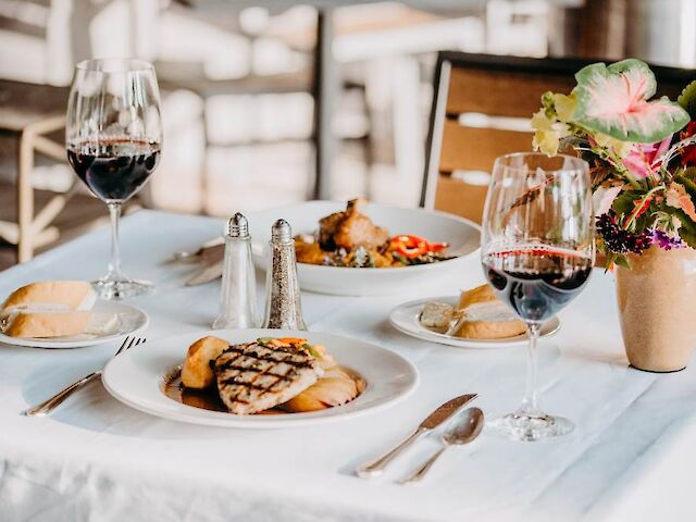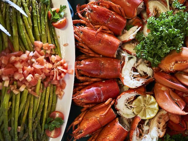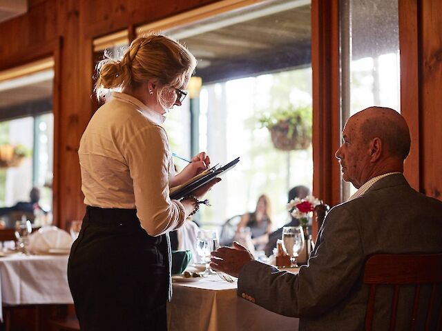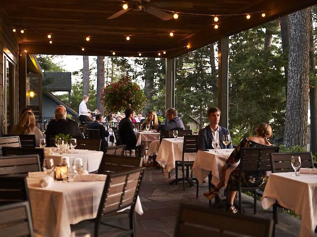 Dinner is served at the Main Lodge and porch when not at Cookout Point. We offer our nightly changing five-course menu, featuring lobster in addition to a variety of entree choices. Pickup dinner service is available only when dinner service is taking place in the Main Lodge. Dinner at Cookout Point is served two nights per week. Join us before dinner at 5:30 pm on the terrace and enjoy a cocktail or glass of wine from our bar.