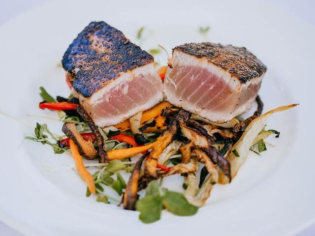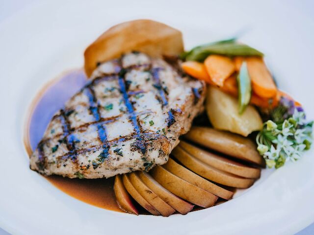 We offer lunch daily from 12:30 to 1:30pm. The dining room menu changes daily and pre-ordered to-go lunch boxes are available. From Father's Day in June through Labor Day we offer the choice of lunch at the Main Lodge or at Cookout Point.