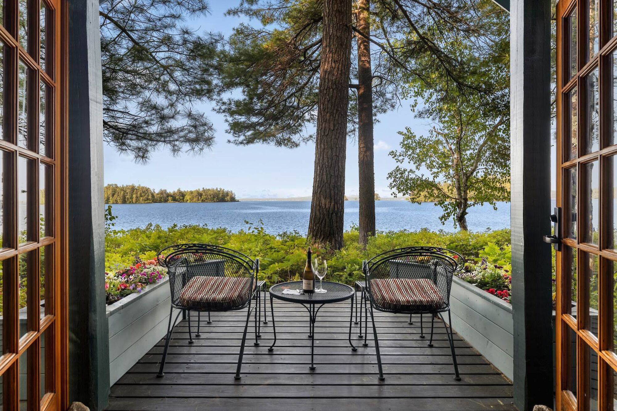 Stone's Throw has a premier location just a “Stone’s Throw” from the lake. The cottage has a cobblestone patio, and the double-sided living room has a fieldstone fireplace at one end and French doors leading to a open deck with comfortable chairs facing the lake and sunset terrace.