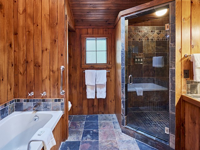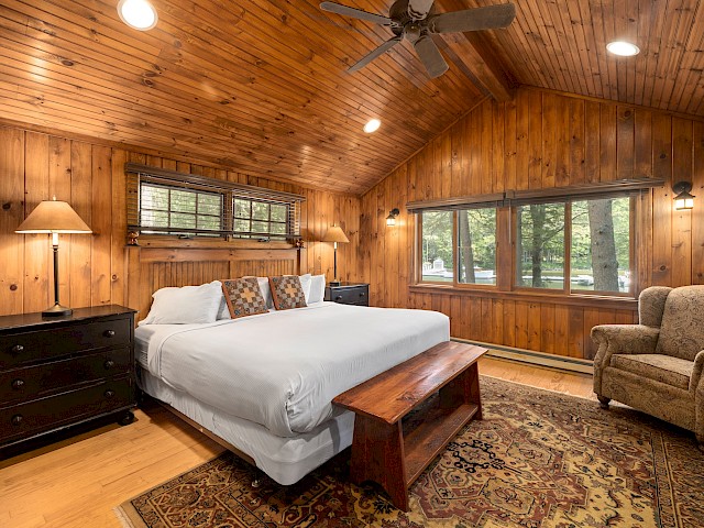 Cove 1 has a front porch with comfortable wicker furnishings and is conveniently located near the boat basin and Cookout Point. The living room has a cathedral ceiling, fieldstone fireplace, flat screen TV, and wet bar with undercounter refrigerator. A dressing area with vanity sits outside the separate bedroom which has a king bed and lake views. The full bath has a soaking tub and separate shower. There is a queen-size pullout couch in the living room and room for cot or pack ‘n play.