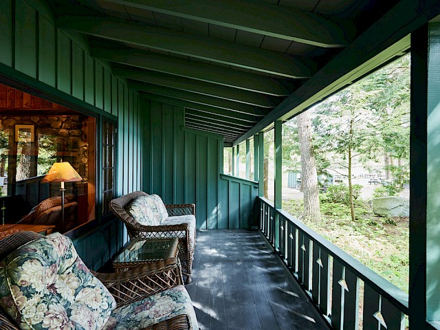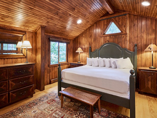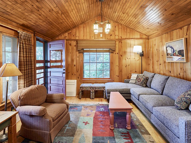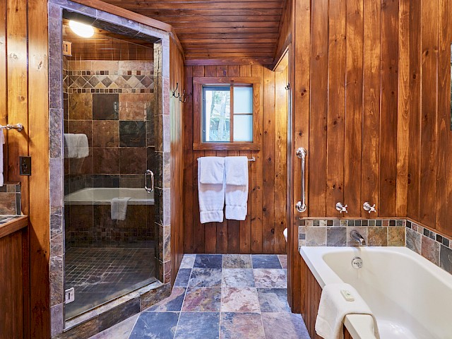Cove 2 has a front porch with comfortable wicker furnishings and is conveniently located near the boat basin and Cookout Point. The living room has a cathedral ceiling, fieldstone fireplace, flat screen TV, and wet bar with undercounter refrigerator. A dressing area with vanity sits outside the separate bedroom which has a king bed and lake views. The full bath has a soaking tub and separate shower. There is a queen sized pullout couch in the living room and room for cot or pack ‘n play.