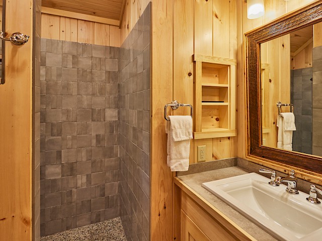 Raven has a roomy covered porch with rockers and lake view over the very end of our single tennis court and is conveniently located near our Main Lodge. The living room has a cathedral ceiling, fieldstone fireplace, flat screen TV, and wet bar area with refrigerator. The separate bedroom has a king bed and the full bath has a separate tub and shower. There is a queen-sized pullout couch in the living room and room for cot or pack ‘n play.