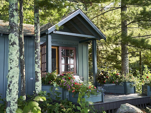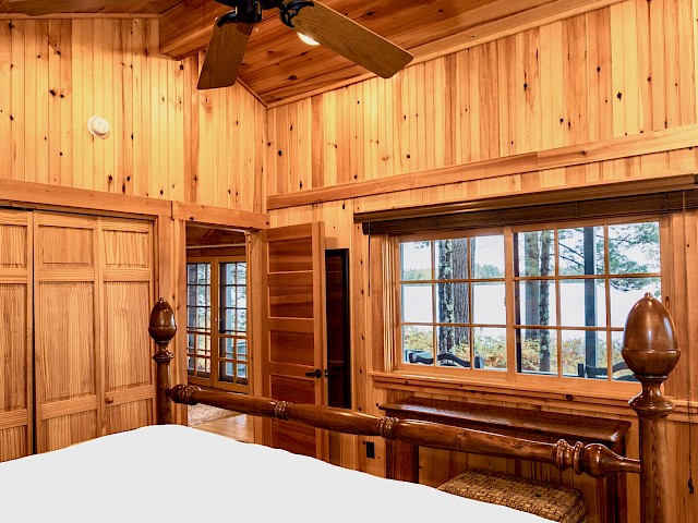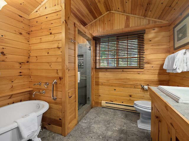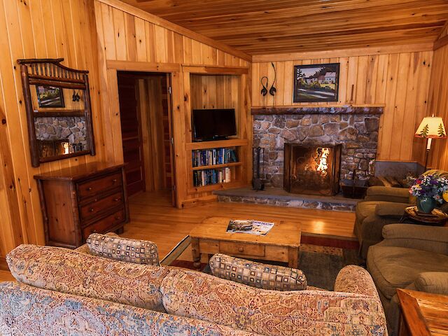 One of our premier one bedroom accommodations, Sunset is located lakeside. The living room has a fieldstone fireplace on one end and French doors facing the lake on the other which lead to a furnished open deck, perfect for relaxing with a good book, enjoying a glass of wine, or watching the sun set over Sebago. The living room has cathedral ceiling, flat screen TV, and wet bar with undercounter refrigerator. The bedroom has a king bed with a lake view. The full bath has double vanity, soaking tub, and separate shower. There is a queen size pull out couch in the living room and room for cot/pack ‘n play.
