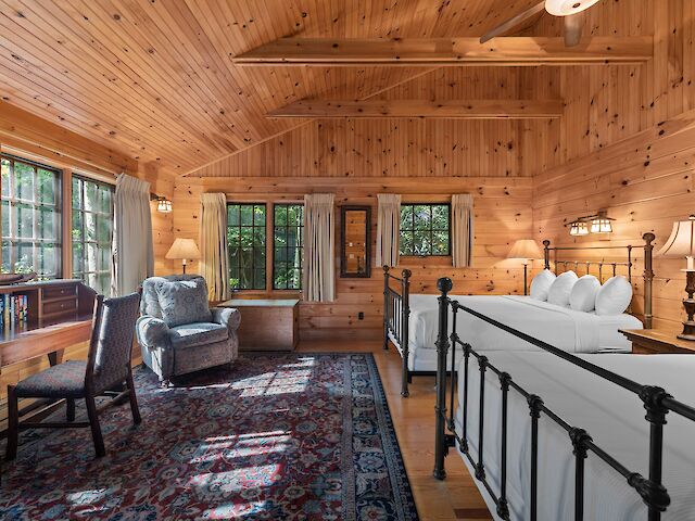 Tamarack, located near our Main Lodge, is one of our largest one bedroom cottages. The furnished front porch has lake views and the living room has cathedral ceiling, fieldstone fireplace, flat screen TV, and wet bar with undercounter refrigerator. Up a few steps is a large walk-in closet, a full bath with soaking tub, separate shower, and a convenient additional vanity just outside. Just behind is the spacious bedroom with two queen beds. There is a queen-size pullout couch in the living room and room for cot/pack ‘n play. There are 11 steps to the front porch.