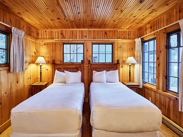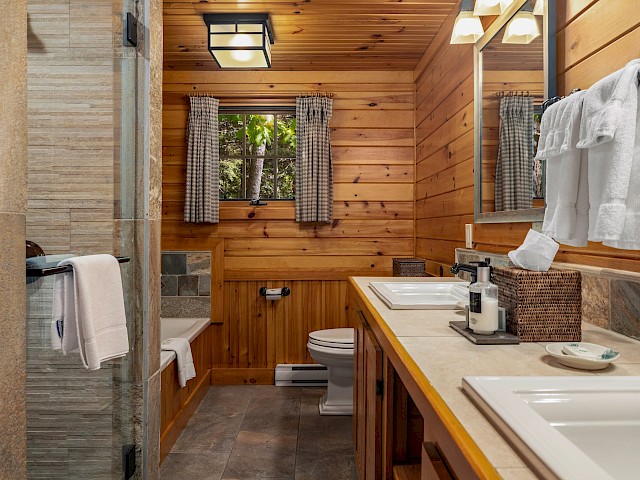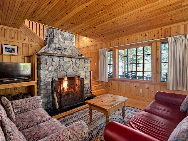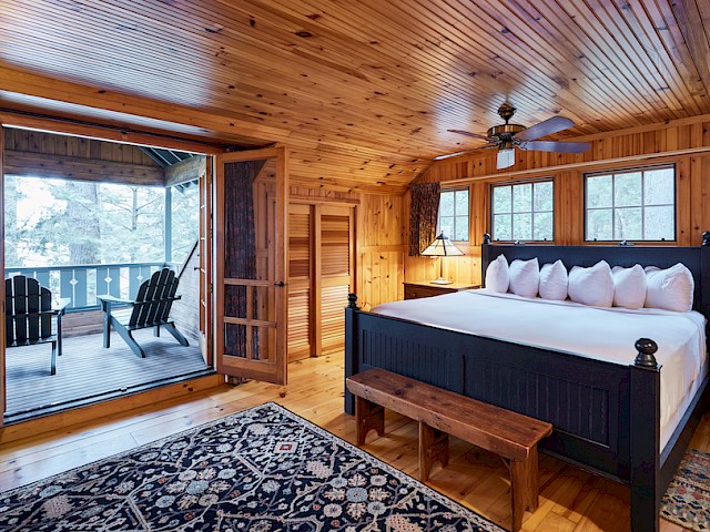 Firefly has a covered front porch with rockers and lake views. The living room has a fieldstone fireplace, wet bar with undercounter refrigerator, and flat screen TV. The first floor bedroom can be set up as a king bed or twin beds. The adjacent full bathroom has a tub/shower combination. Two additional bedrooms are located on the second floor. The primary bedroom has a king bed, private furnished covered balcony, and an en-suite bathroom with combination tub/shower and dual sinks. The smaller second upstairs bedroom can be set up as twin beds or a king bed. The primary bedroom has room for a cot or pack ‘n play. There are 10 steps to the front porch.