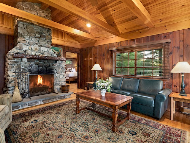 One of our premier two bedroom accommodations, Spruce is located just steps from the lake. The wraparound covered porch provides unparalleled views of Sebago. On one end of the living room is a fieldstone fireplace and on the other a large sliding glass door opens towards the lake onto the porch. The living room has a cathedral ceiling, flat screen TV, and wet bar with undercounter refrigerator. The master bedroom has a king bed and en-suite bathroom with dual vanity, soaking tub and separate shower. The second bedroom can be a king bed or twins and has an identical en-suite bathroom with dual vanity, soaking tub and separate shower. Each bedroom has a private entrance onto the wraparound porch. There is a queensize pullout couch in the living room and room for cot/pack ‘n play. There are 7 steps up to the porch.