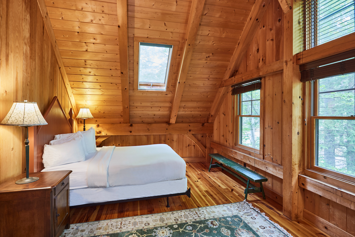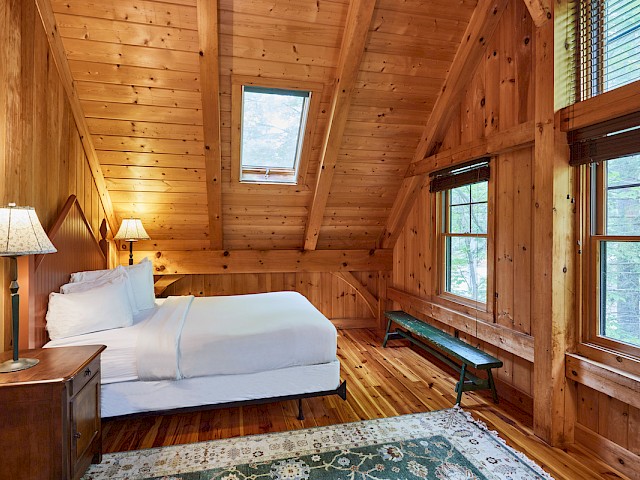 Timbers is a centrally located post and beam cottage with two bedrooms (one with king bed, one with queen) and two full baths (one with shower/tub, one with shower) upstairs and a loft space with twin beds. There is also a small first floor single bed alcove with a half bath adjacent to the nearby living room. There is a large furnished open deck, living room with massive fieldstone fireplace, a dining table (great for family games, crafts and puzzles) and a complete kitchen with a convenient full size refrigerator for drinks and snacks. Timbers does not have a lake view.